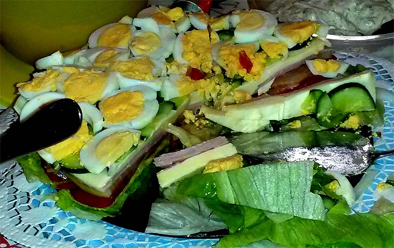An die Gewehre: es geht los mit dem reichhaltigen Büffet, hier z.B. mit einer Salattorte...