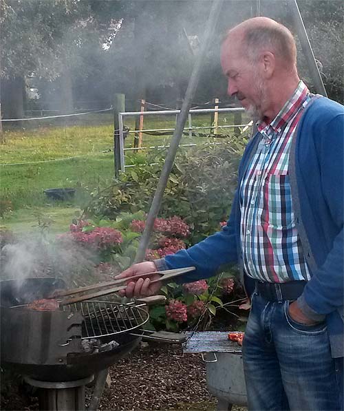 Lässig leger, mit einer Hand in der Tasche, wendet der Grillmeister die lecker duftenden Nackendsteaks! Da läuft einem doch das Wasser im Munde zusammen!
