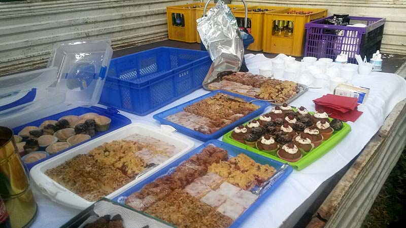 Neben Käffchen und diversen Kaltgetränken locken verführerisch die Plaatenkuchen und Muffins. Immerhin fast eine ganze LKW-Ladung voll...