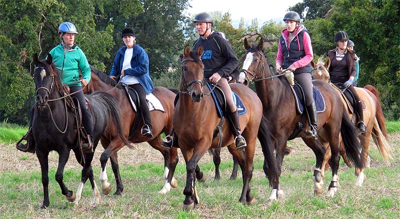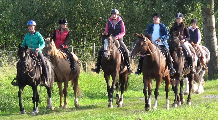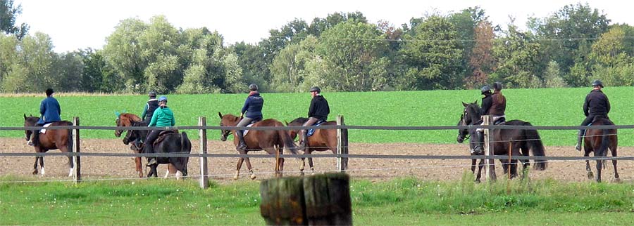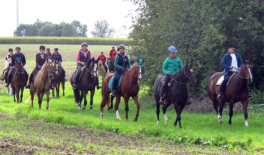 Gemächlich trottet die Reiterschar wohl geordnet in die wunderbare Natur.