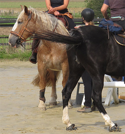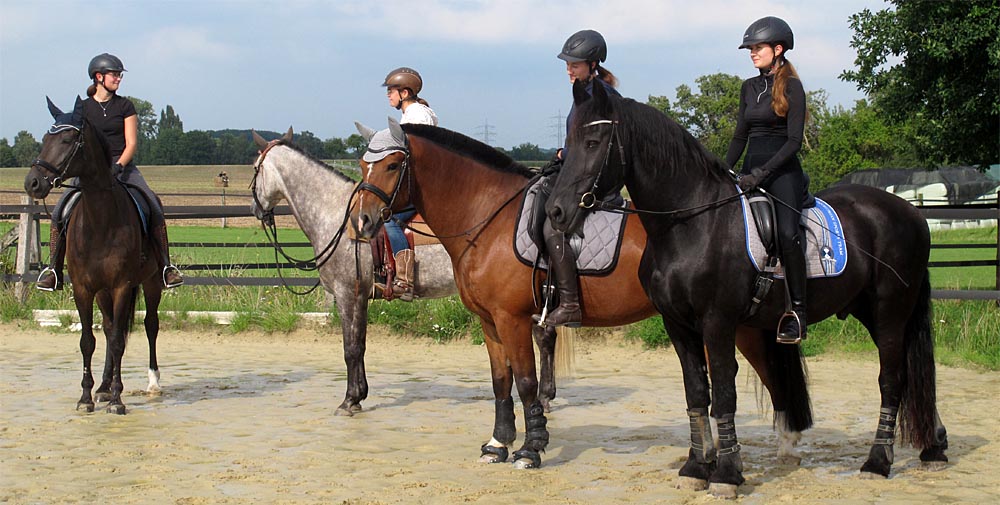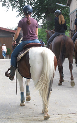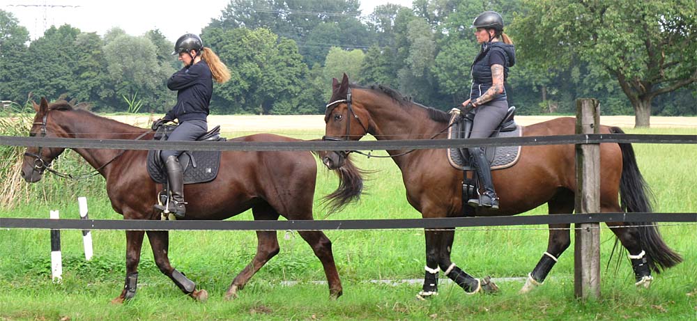 Groß und Klein reiten gemeinsam, das löst unter den anderen Pferden ein sachtes Getuschel und leichtes Schnauben aus.