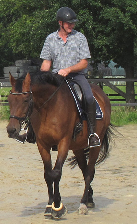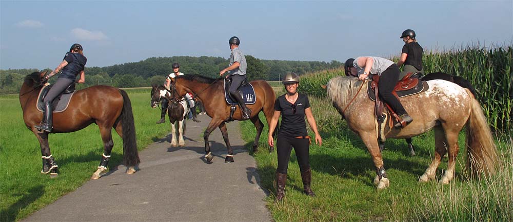Im saftigen, grünen Gras am Wegesrand auf seinem Braunen sitzend beordert Thommy die Reitgesellschaft von der Straße