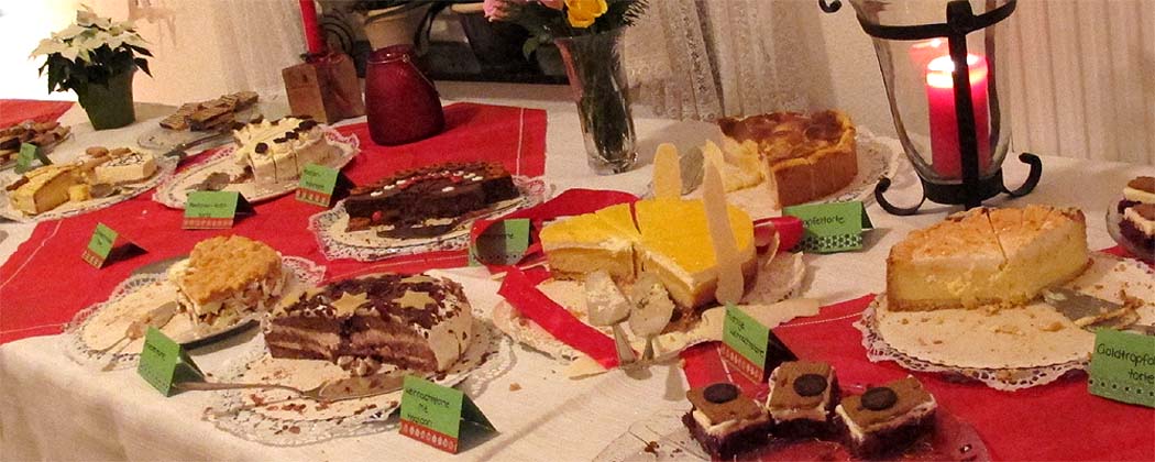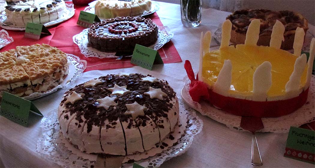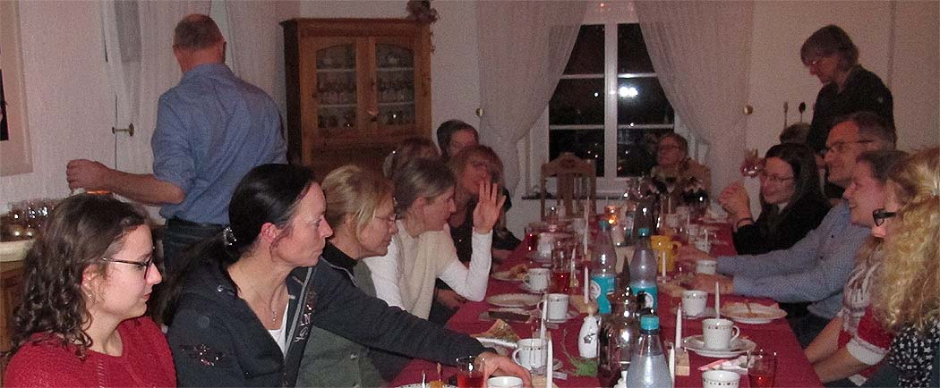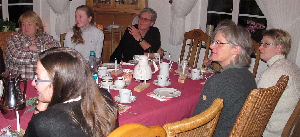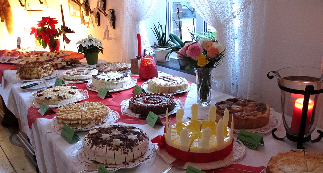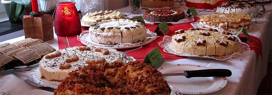 ![]() Ganze 2 Jahre hat das verflixte Corona-Virus verhindert, das unser traditionelles gemütliches Kaffeetrinken in Krolls "guter Stube" stattfinden konnte. Doch nun ist es wie eine Befreiung: Chefkonditorin Anni hat lange auf der Stelle getreten und jetzt alles rausgelassen, was sich in dieser Zeit aufgestaut hat. Entstanden sind wie immer professionelle Kuchenkreationen "erster Sahne"! ![]() Ist das nicht genial? Und dabei hat jede Torte einen Namen mit naturgrünem Schild und akkurater Schrift, fast so wie bei den Schulkindern in der Wieseschule, kreiert von unserer "Schaulmesterin"! ![]() Da könnte sich das Café Fromme in Soest eine Scheibe oder ein Stückchen von abschneiden! ![]() Wikipedia schreibt: Eine Torte ist ein feiner Kuchen, der meist mit Creme gefüllt, bestrichen und/oder mit Früchten oder Sternen belegt und verziert ist. Meist ist die Form kreisrund, aber auch andere Formen sind gebräuchlich wie Rechtecke, Kuppelform, Herzform u.v.m.... und ganz wichtig: "Backen macht glücklich!!!" ![]() Diese perfekten Gourmet-Schätze sind einfach zu schade zum Verschnabulieren, aber was soll man machen, wenn beim Ansehen die eigene Spucke im Schlund überläuft... ![]() Zum weihnachtlichen Kaffeetafel-Ambiente gehört natürlich eine ansprechende Dekoration, denn man weiß: "Das Auge isst mit!" ![]() ![]() Dazu gehören natürlich Engel, Sterne und Kerzenschein und ... das gute "Kaffeeservice", ![]() ...ebenso Geweih-Figuren und Laternchen! ![]() Aber das Wichtigste ist nun mal das Erscheinen der lieben Gäste wie hier der jungen, anmutigen Reit-Amazonen, die schon in freudiger Erwartung sind. ![]() Auch die Angehörigen und Freunde sind froh, diesen herrlichen Nachmittag genießen zu dürfen! ![]() Kaffee und Kuchen werden intensiv genossen, als sich mitten im Raum jemand zu Wort meldet. ![]() Alle lauschen gebannt auf den kleinen launigen Vortrag, der wie gewohnt als Zielfigur den Chefbereiter Thommy von der Merklingser "Drei-Eichen-Hofreitschule" im Visier hat. ![]() Wie man sieht, sind alle gebannt und gespannt! ![]() Thommy lässt die Ansprache geduldig über sich ergehen und hält sich schüchtern an seiner Flasche fest. Am Schluss ertönt anhaltender Beifall! ![]() Am Abend gibt es noch viel Lustiges von der Reiterei und mehr zu erzählen! Schlussendlich sieht man, dass die Gäste kräftig zugelangt haben, jedoch von ihrer Magen-Füllmenge ihre Grenzen hatten. Die delikaten Reste werden bestimmt zwischendurch in der Weihnachtszeit noch weggefuttert! Danke an Torten-Anni von der Weihnachtsbäckerei und an das Orgateam! Es war ein wunderschöner langer Nachmittag, der gewiss den Zusammenhalt und den Teamgeist auf dem Hof gefördert hat. Bis zum nächsten Event... > Aktivitäten < - > Startseite < |