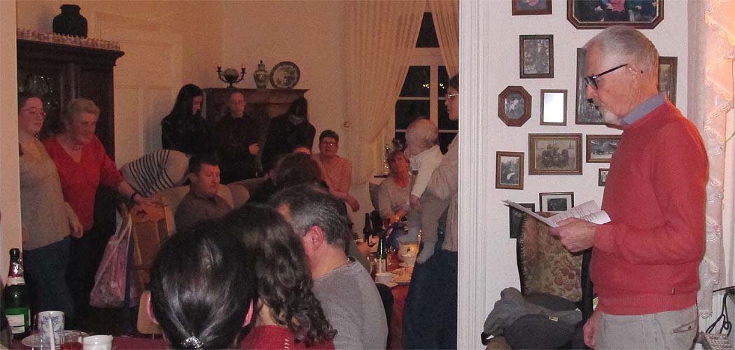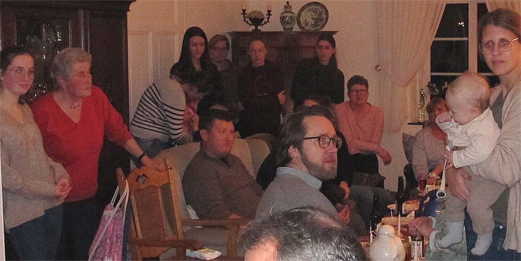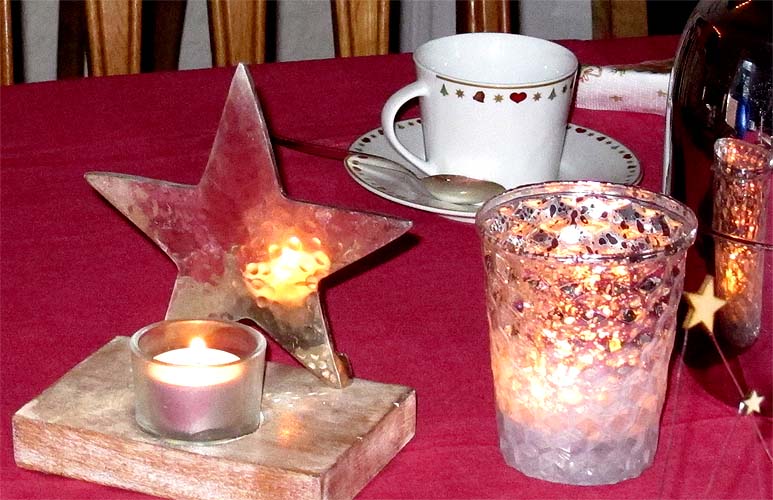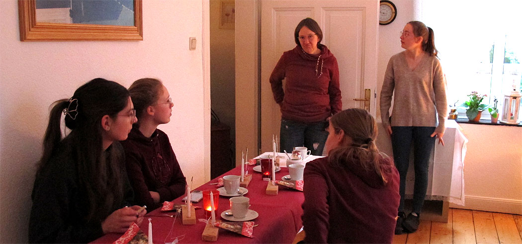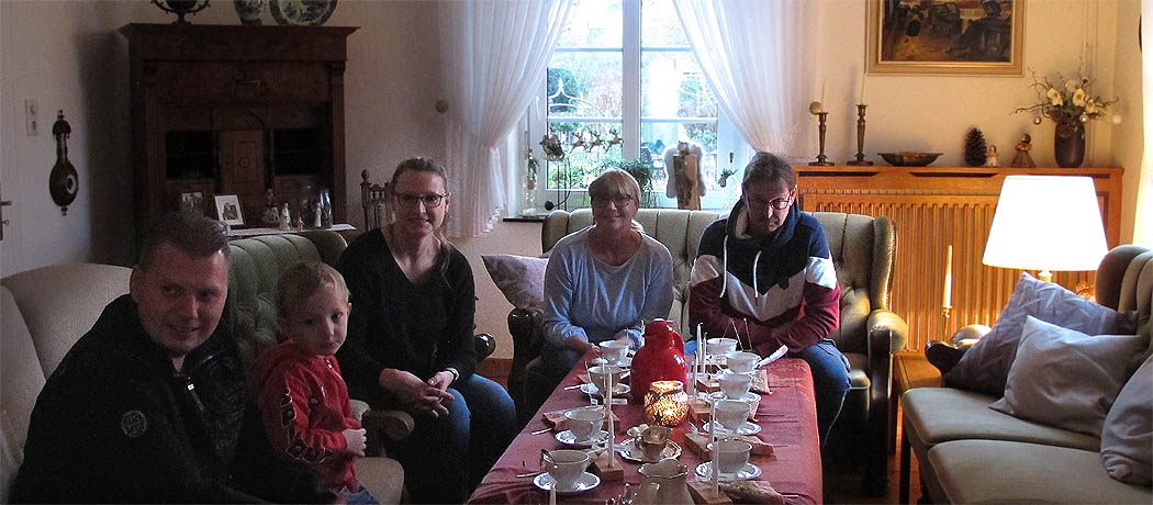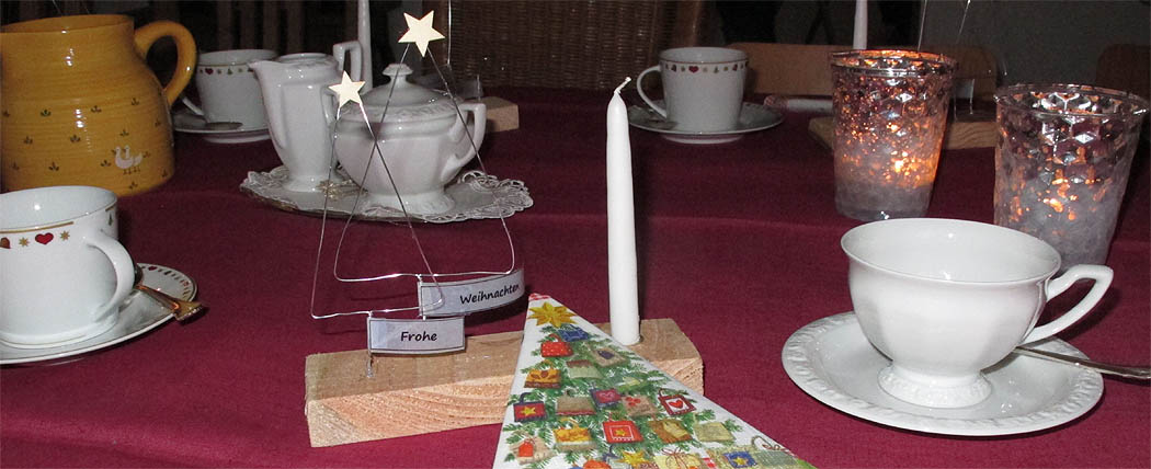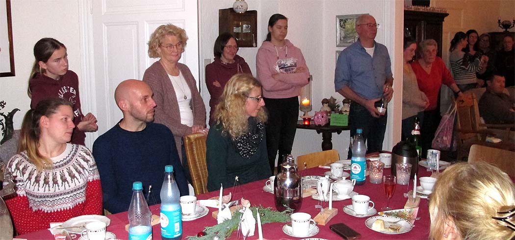 ![]() Ganze 2 Jahre hat das verflixte Corona-Virus verhindert, das unser traditionelles gemütliches Kaffeetrinken in Krolls "guter Stube" stattfinden konnte. Doch nun ist es wie eine Befreiung: Chefkonditorin Anni hat lange auf der Stelle getreten und jetzt alles rausgelassen, was sich in dieser Zeit aufgestaut hat. Entstanden sind wie immer professionelle Kuchenkreationen "erster Sahne"! ![]() Ist das nicht genial? Und dabei hat jede Torte einen Namen mit naturgrünem Schild und akkurater Schrift, fast so wie bei den Schulkindern in der Wieseschule, kreiert von unserer "Schaulmesterin"! ![]() Da könnte sich das Café Fromme in Soest eine Scheibe oder ein Stückchen von abschneiden! ![]() Wikipedia schreibt: Eine Torte ist ein feiner Kuchen, der meist mit Creme gefüllt, bestrichen und/oder mit Früchten oder Sternen belegt und verziert ist. Meist ist die Form kreisrund, aber auch andere Formen sind gebräuchlich wie Rechtecke, Kuppelform, Herzform u.v.m.... und ganz wichtig: "Backen macht glücklich!!!" ![]() Diese perfekten Gourmet-Schätze sind einfach zu schade zum Verschnabulieren, aber was soll man machen, wenn beim Ansehen die eigene Spucke im Schlund überläuft... ![]() Zum weihnachtlichen Kaffeetafel-Ambiente gehört natürlich eine ansprechende Dekoration, denn man weiß: "Das Auge isst mit!" ![]() ![]() Dazu gehören natürlich Engel, Sterne und Kerzenschein und ... das gute "Kaffeeservice", ![]() ...ebenso Geweih-Figuren und Laternchen! ![]() Aber das Wichtigste ist nun mal das Erscheinen der lieben Gäste wie hier der jungen, anmutigen Reit-Amazonen, die schon in freudiger Erwartung sind. ![]() Auch die Angehörigen und Freunde sind froh, diesen herrlichen Nachmittag genießen zu dürfen! ![]() Kaffee und Kuchen werden intensiv genossen, als sich mitten im Raum jemand zu Wort meldet. ![]() Alle lauschen gebannt auf den kleinen launigen Vortrag, der wie gewohnt als Zielfigur den Chefbereiter Thommy von der Merklingser "Drei-Eichen-Hofreitschule" im Visier hat. ![]() Wie man sieht, sind alle gebannt und gespannt! ![]() Thommy lässt die Ansprache geduldig über sich ergehen und hält sich schüchtern an seiner Flasche fest. Am Schluss ertönt anhaltender Beifall! ![]() Am Abend gibt es noch viel Lustiges von der Reiterei und mehr zu erzählen! Schlussendlich sieht man, dass die Gäste kräftig zugelangt haben, jedoch von ihrer Magen-Füllmenge ihre Grenzen hatten. Die delikaten Reste werden bestimmt zwischendurch in der Weihnachtszeit noch weggefuttert! Danke an Torten-Anni von der Weihnachtsbäckerei und an das Orgateam! Es war ein wunderschöner langer Nachmittag, der gewiss den Zusammenhalt und den Teamgeist auf dem Hof gefördert hat. Bis zum nächsten Event... > Aktivitäten < - > Startseite < |